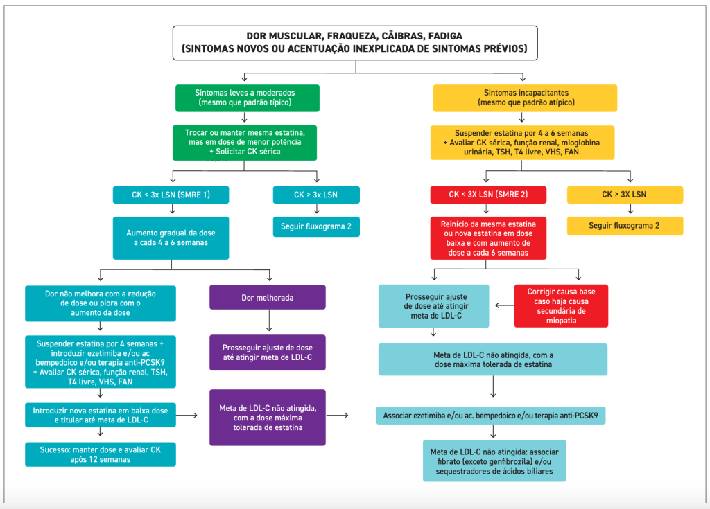 Vale a pena conferir o algoritmo de abordagem da própria diretriz sob sintomas musculares e possível correlação com estatina: